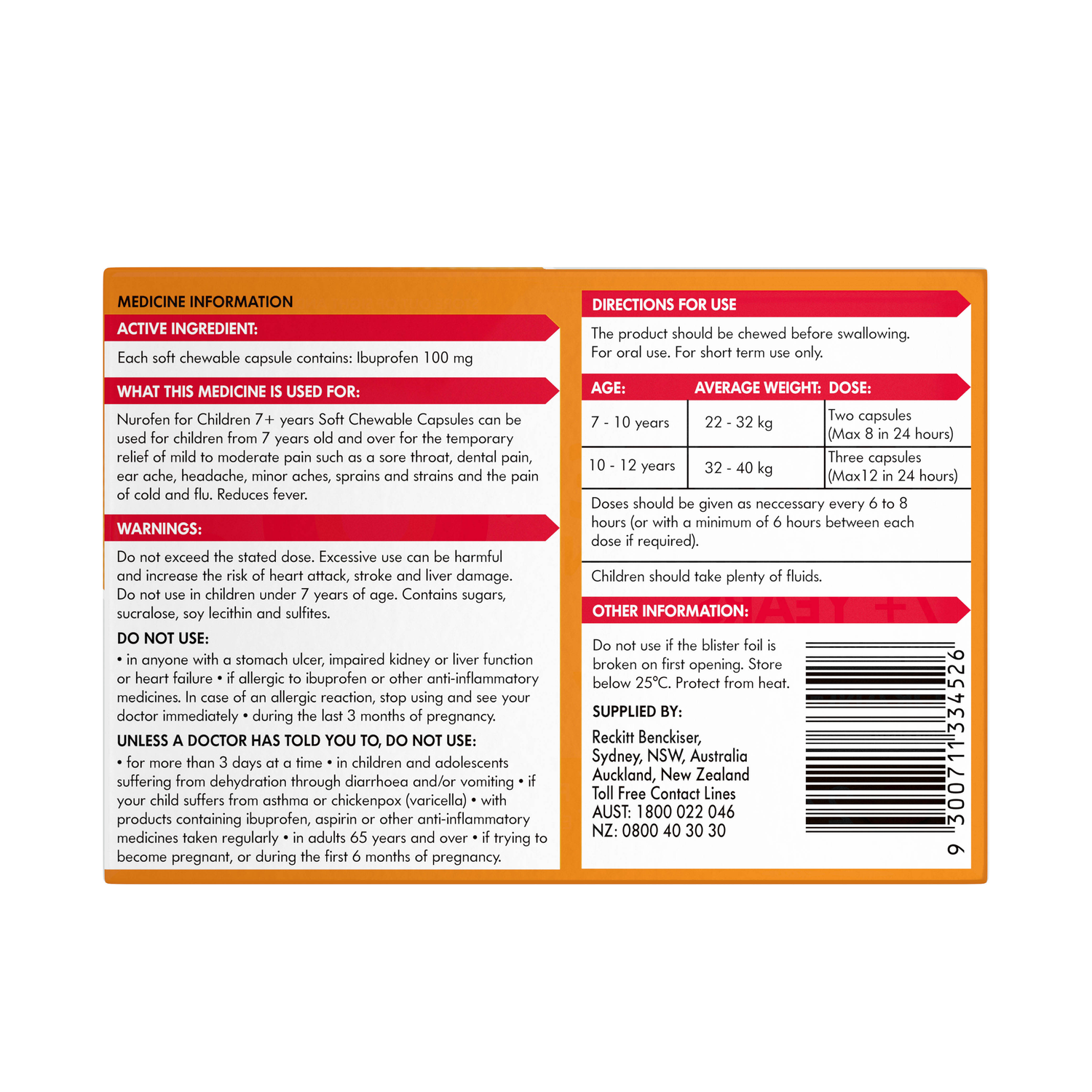 Contains -Contains sugars, sucralose -Ingredients acesulfame potassium citric acid disodium edetate Flavour fumaric acid Gelatin glycerol hypromellose iron oxide red iron oxide yellow isopropyl alcohol lecithin liquid glucose medium chain triglycerides propylene glycol purified water stearic acid sucralose sucrose titanium dioxide ibuprofen 100 mgFeature