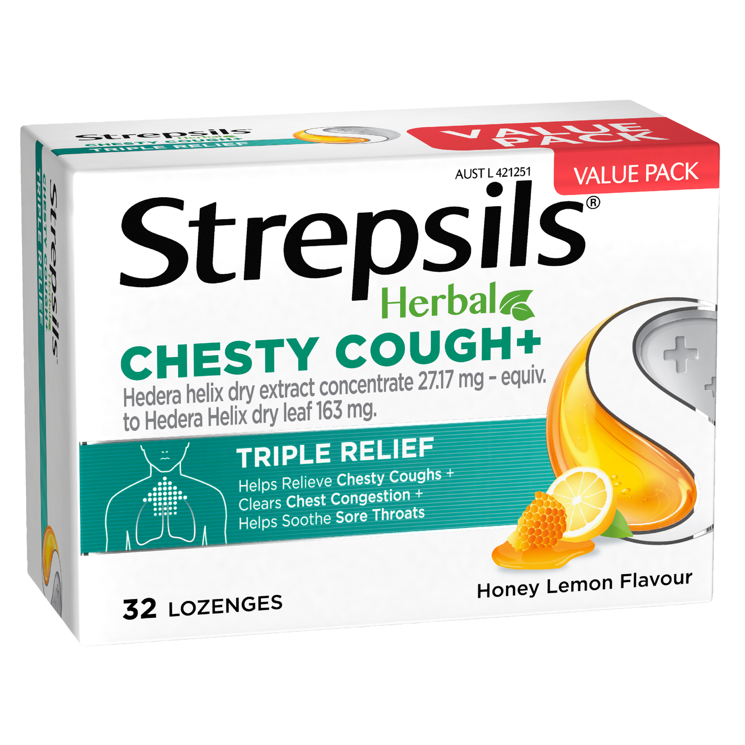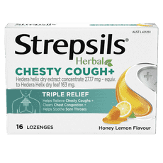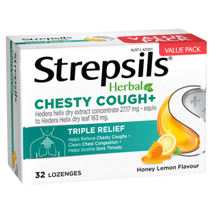 Strepsils Herbal Chesty Cough+ Lozenges provide triple relief from chesty cough, chest congestion and sore throat with its effective Triple Relief formula.
